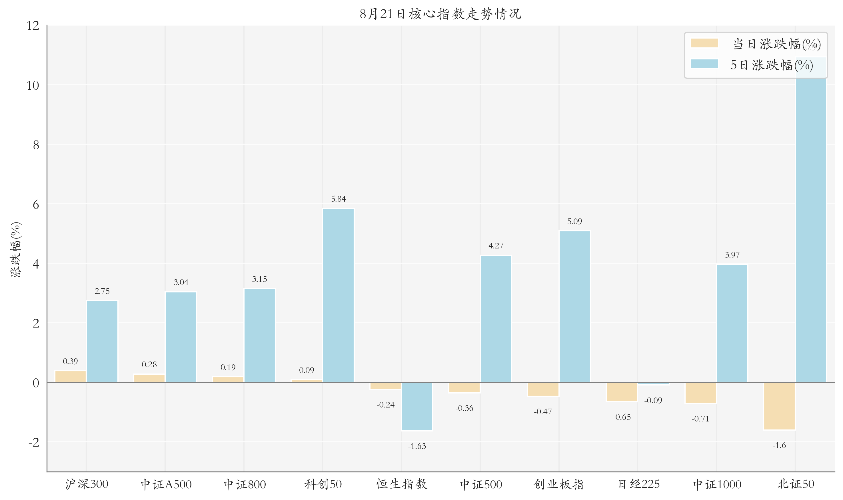 统计A股与海外主要核心指数走势◈★,今日(8月21日◈★,下同)三大指数涨跌不一◈★,其中上证指数上涨0.13%◈★,收于3771.1点◈★,日内最高3787.98点◈★;深证成指下跌0.06%◈★,收于11919.76点◈★,日内最高12011.78点◈★;创业板指下跌0.47%◈★,收于2595.47点◈★,日内最高2626.37点◈★。今日沪深300◈★、中证A500与中证800走势排名靠前◈★,日涨跌幅分别为0.39%日本一卡二卡三卡不卡◈★、0.28%与0.19%◈★;近5个交易日北证50◈★、科创50与创业板指的走势排名靠前◈★,近5日涨跌幅分别为10.93%◈★、5.84%与5.09%日本一卡二卡三卡不卡◈★。