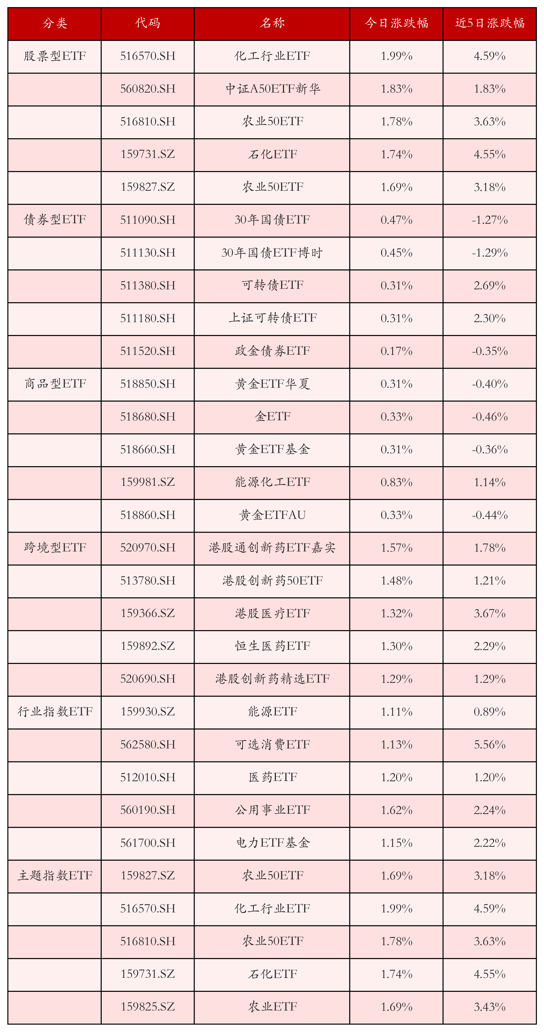从不同投资种类◈★、行业◈★、主题的ETF产品中找出今日走势行情排名前5的ETF基金◈★,今日涨幅靠前的ETF产品如下表所示澳门太阳城官网◈★!◈★。股票型ETF中涨跌幅排名前3位的ETF产品分别为化工行业ETF(516570.SH)太阳成集团官网◈★、中证A50ETF新华(560820.SH)和农业50ETF(516810.SH)◈★,今日收益率分别为1.99%◈★、1.83%和1.78%◈★。