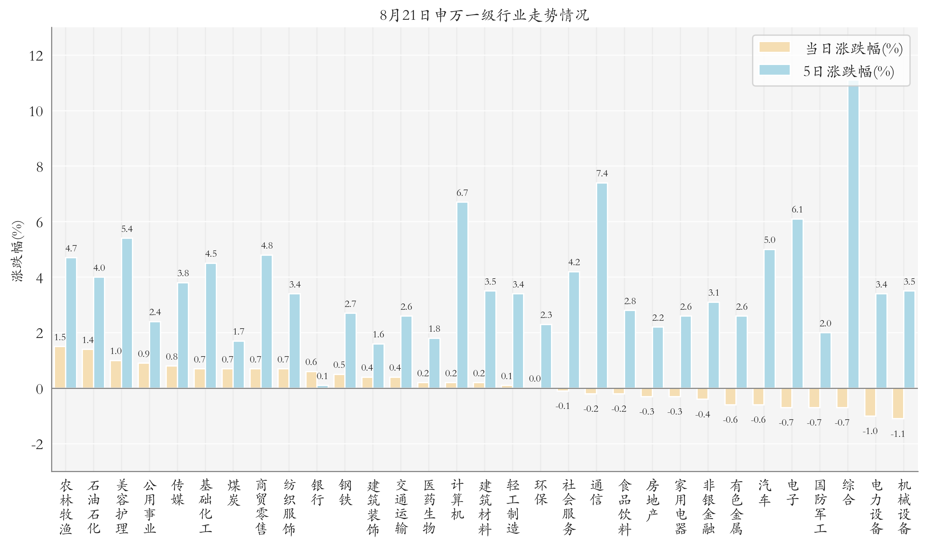 统计今日全部申万一级行业涨跌幅情况◈★,农林牧渔◈★、石油石化与美容护理今日走势排名靠前◈★,日涨跌幅分别为1.5%◈★、1.39%与0.98%◈★,机械设备◈★、电力设备与综合的走势排名靠后◈★,日涨跌幅分别是-1.08%太阳成集团官网◈★、-0.98%与-0.73%◈★;近5个交易日综合◈★、通信与计算机的走势排名靠前◈★,近5日涨跌幅分别为11.1%◈★、7.44%与6.72%◈★,银行◈★、建筑装饰与煤炭的走势排名靠后日本一卡二卡三卡不卡tyc太阳成◈★。◈★,近5日涨跌幅分别为0.07%◈★、1.57%与1.68%◈★。